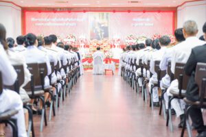 โดยพิธีการเริ่มด้วยการวางพวงมาลาจากผู้แทนหน่วยงานต่าง ๆ ตามลำดับ จากนั้นผู้ว่าราชการจังหวัดขอนแก่น จุดธูปเทียนบูชาพระรัตนตรัยและถวายเครื่องทองน้อยหน้าพระบรมสาทิสลักษณ์ พร้อมกล่าวถวายอาศิรวาทราชสดุดี โดยมีพระสงฆ์จำนวน 10 รูปเจริญพระพุทธมนต์ ผู้ว่าราชการจังหวัดขอนแก่น พร้อมหัวหน้าส่วนราชการถวายจตุปัจจัยไทยธรรมและทอดผ้าไตรแด่พระสงฆ์ เพื่ออุทิศถวายเป็นพระราชกุศล