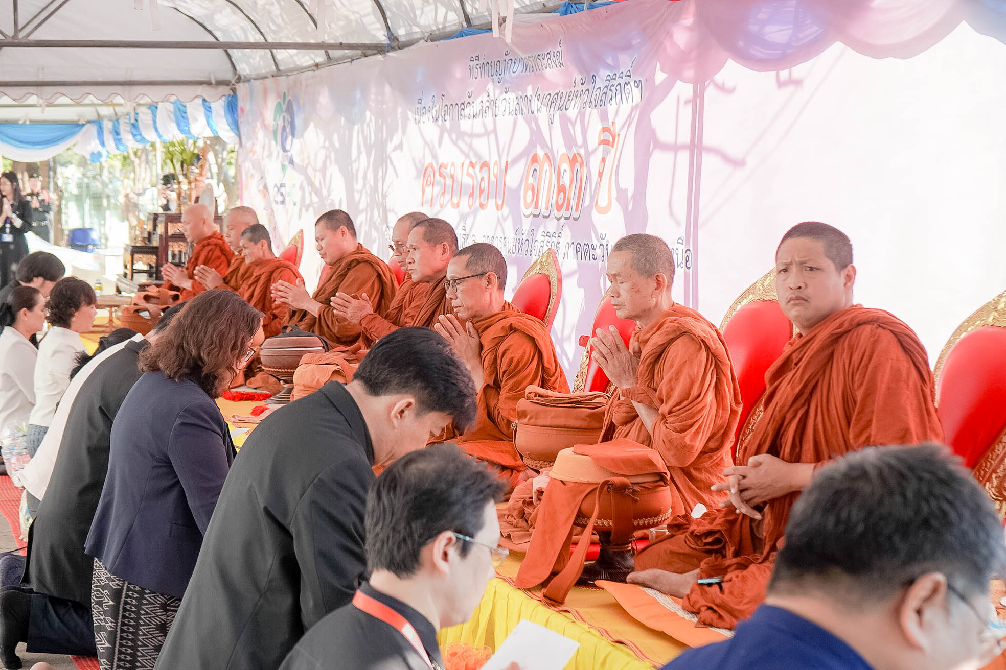 พิธีสิริมงคลเพื่อน้อมรำลึกในพระมหากรุณาธิคุณ ในช่วงเช้าเวลา 07.00 น. รศ.นพ.ชาญชัย พานทองวิริยะกุล อธิการบดี มข. ได้นำคณะผู้บริหารร่วม พิธีทำบุญตักบาตรพระภิกษุสงฆ์ จำนวน 34 รูป ณ บริเวณลานด้านหน้าพระหฤทัยสัมฤทธิ์ผล (ฝั่งทิศตะวันออกติดถนนมิตรภาพ)
